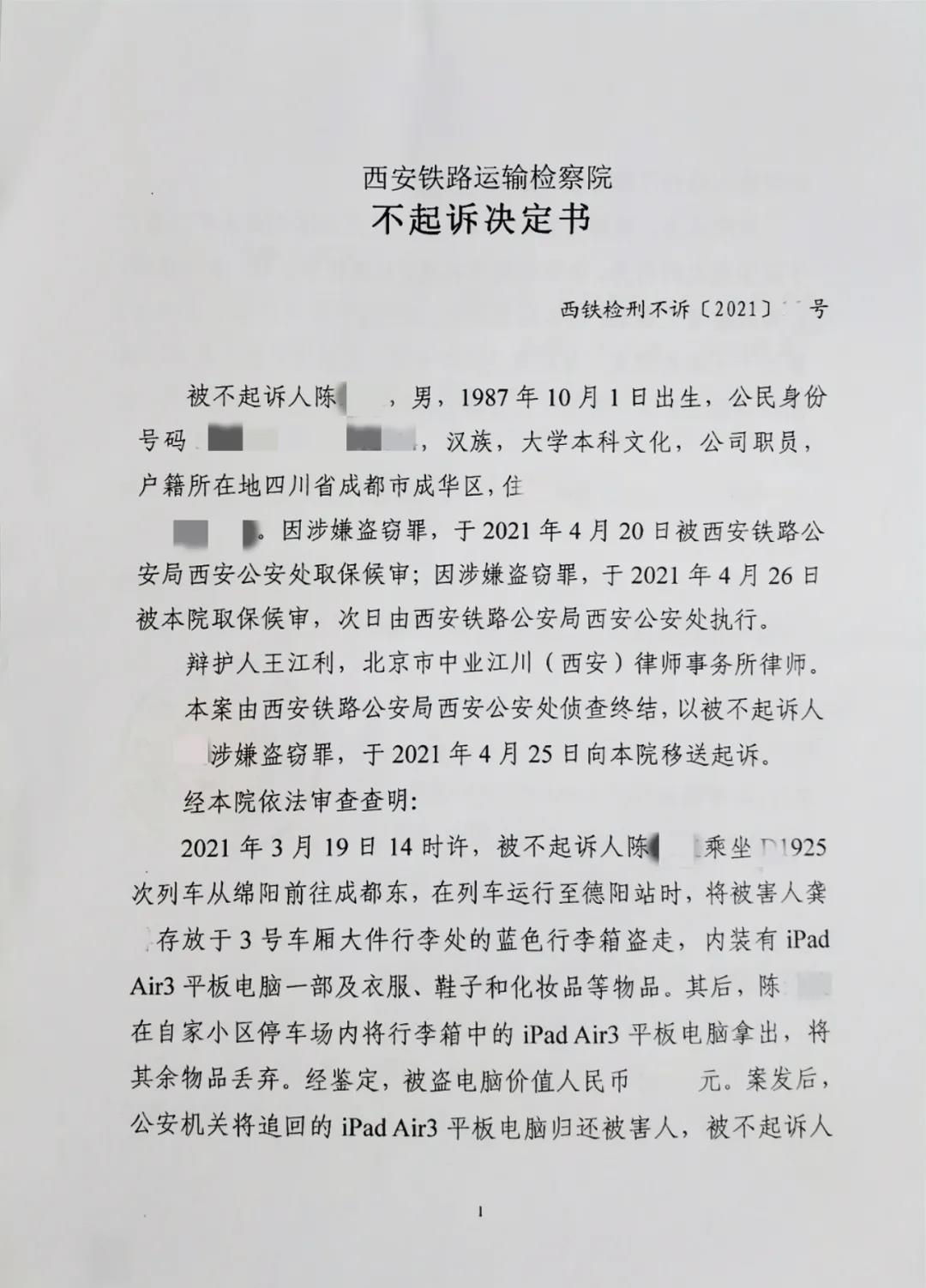 2021年5月20日,西安铁路运输检察院采纳了我所王江利律师的辩护意见,以公开听证的方式审查一起盗窃案件后,对当事人陈某作出不起诉决定。